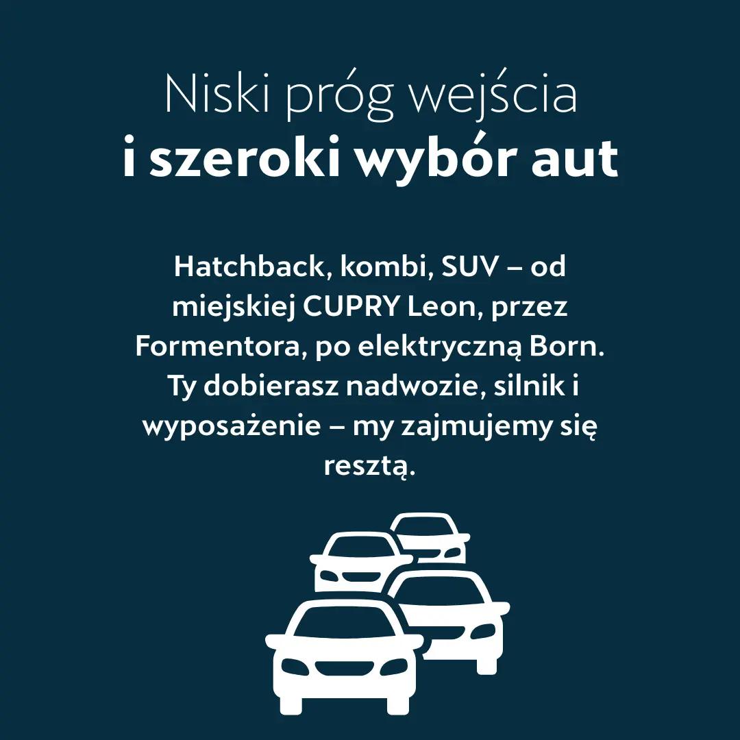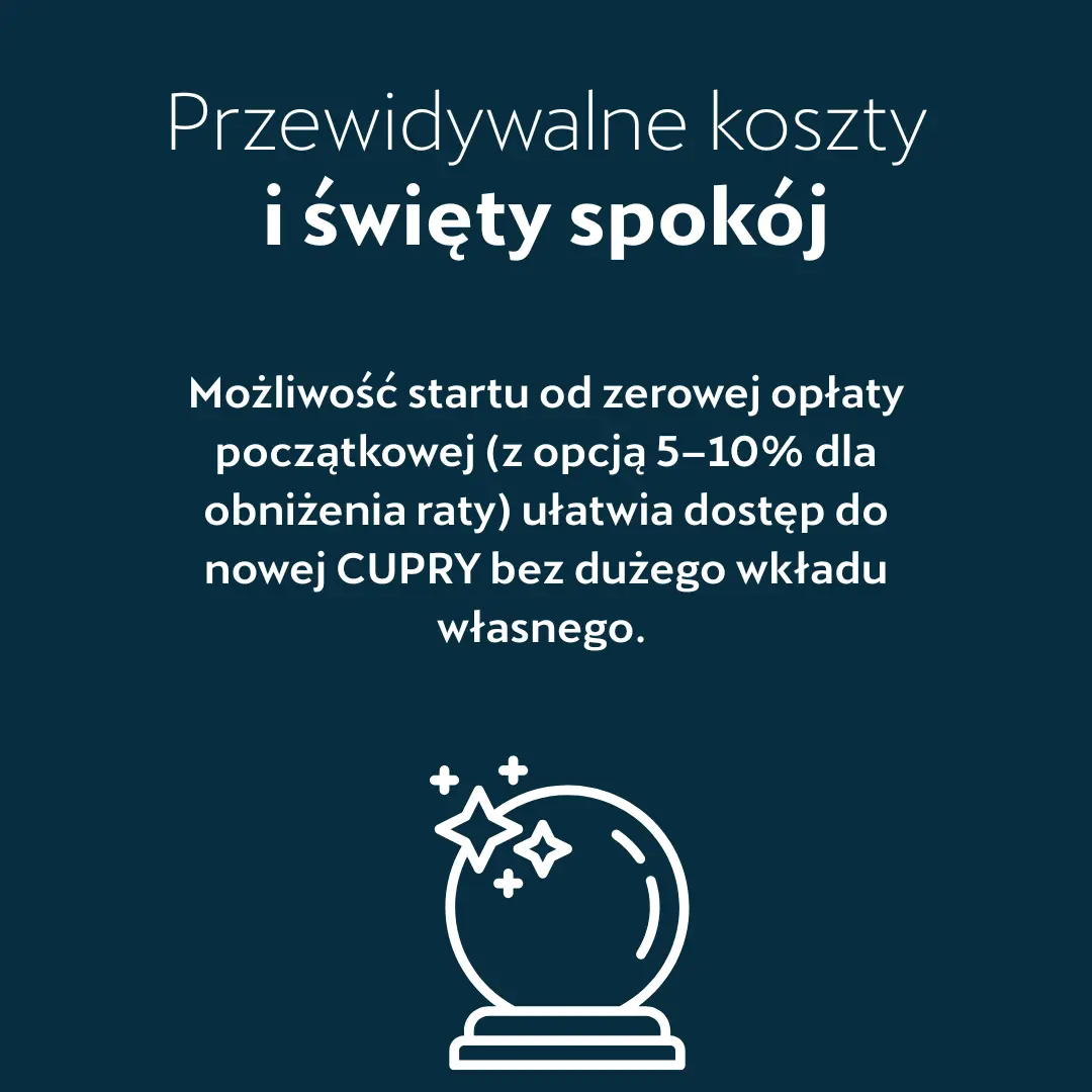 *Leasing klasyczny. Suma opłat 103% dostępna dla parametrów leasingu: opłata wstępna: 20%, okres leasingu: 36 miesięcy, wartość wykupu: 36 miesięcy - 1%. LEASING KLASYCZNY - Suma opłat 103 - 105% dostępna jest dla następujących parametrów leasingu: opłata wstępna: 20%, okres leasingu: 36 miesięcy, wartość wykupu: 36 miesięcy - 1%. Oferta dla przedsiębiorców. LEASING JAK ABONAMENT - opłata wstępna: 0-30%, okres leasingu: 48 miesięcy, roczny przebieg 10 000 km, finalna rata określona w umowie. Oferta dla przedsiębiorców. Ilekroć mowa jest o miesięcznym koszcie elementu wyposażenia opcjonalnego rozumie się przez to zwiększenie raty miesięcznej CUPRA i CUPRA Leasing Jak Abonament wyliczonej dla przedsiębiorców, przygotowana przez Volkswagen Financial Services Polska Sp. z o.o.. Prezentowane miesięczne raty to wartość netto rat dla oferty CUPRA i CUPRA Leasing Jak Abonament. Ceny przyjęte do kalkulacji rat dostępne są w salonach. Niniejsza informacja nie stanowi oferty w rozumieniu kodeksu cywilnego. Dostępność i warunki produktu mogą ulec zmianie. Warunki produktu określa umowa. Pod nazwą CUPRA Financial Services oferowane są usługi bankowe (przez Volkswagen Bank Polska GmbH sp. z o.o. Oddział w Polsce), usługi leasingowe i mobilność (przez Volkswagen Financial Services Polska Sp. z o.o.) oraz usługi ubezpieczeniowe (przez Volkswagen Bank Polska GmbH sp. z o.o. Oddział w Polsce oraz Volkswagen Serwis Ubezpieczeniowy sp. z o.o. działające jako agenci ubezpieczeniowi).